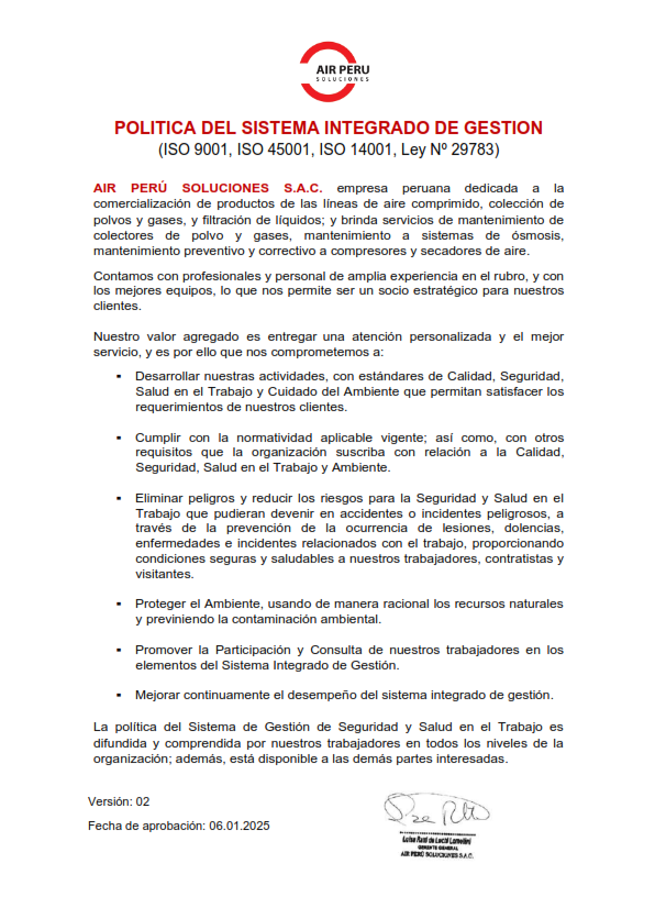 En AIR PERÚ SOLUCIONES S.A.C., reafirmamos nuestro compromiso con la excelencia, la seguridad, la sostenibilidad y la mejora continua a través de la implementación de nuestro Sistema Integrado de Gestión (SIG).